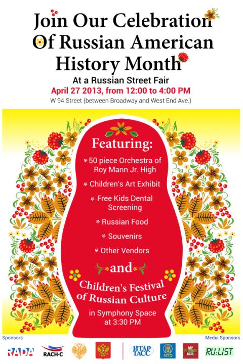 A “Street Fair” celebrating “Russian-American History Month” will take place alongside the Symphony Space theater on 94th St. from Broadway to West End Avenue from 12 noon to 4pm on Saturday April 27.